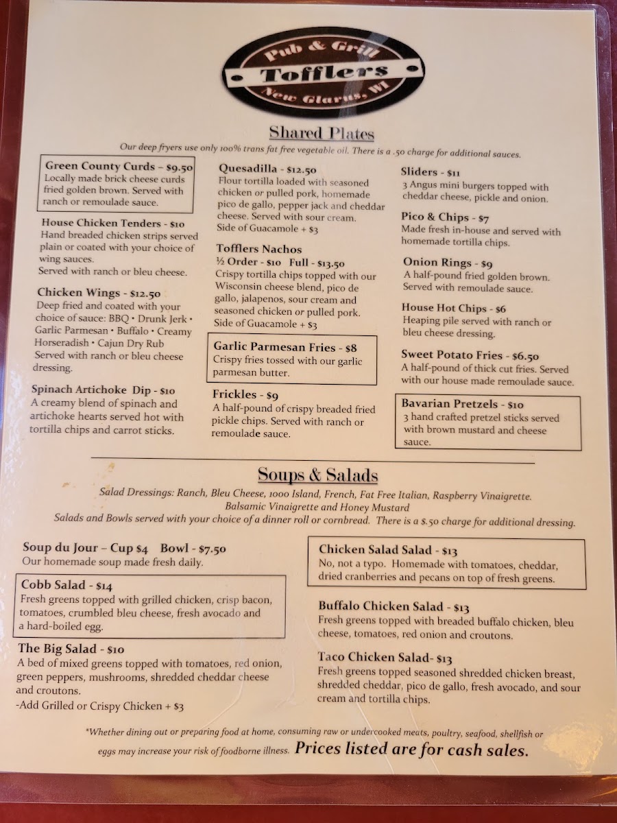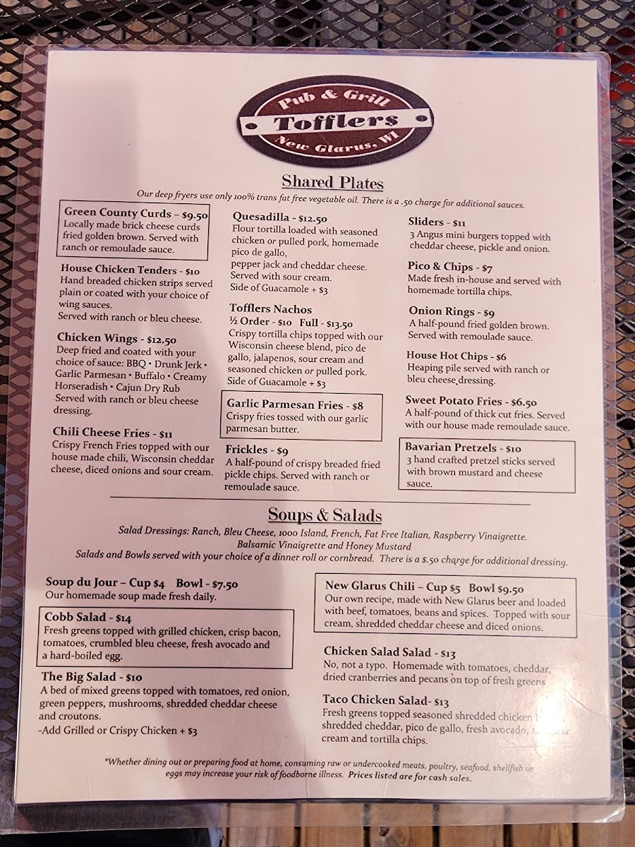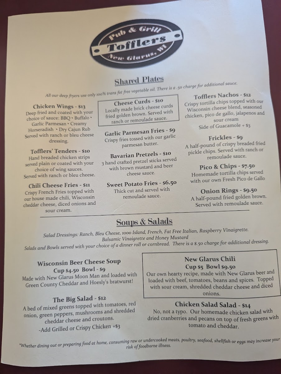 Welcome to Tofflers Pub & Grill, a hidden gem nestled in the heart of New Glarus, WI. With its inviting atmosphere, this pub is perfect for both casual meals and special gatherings. The menu offers an enticing array of options, including hearty soups like the New Glarus Chili and fresh salads such as the Cobb and Balsamic Beef Salad. For those with a sweet tooth, the dessert selection features favorites like New York Cheesecake and a delightful Giant Cookie Sundae.