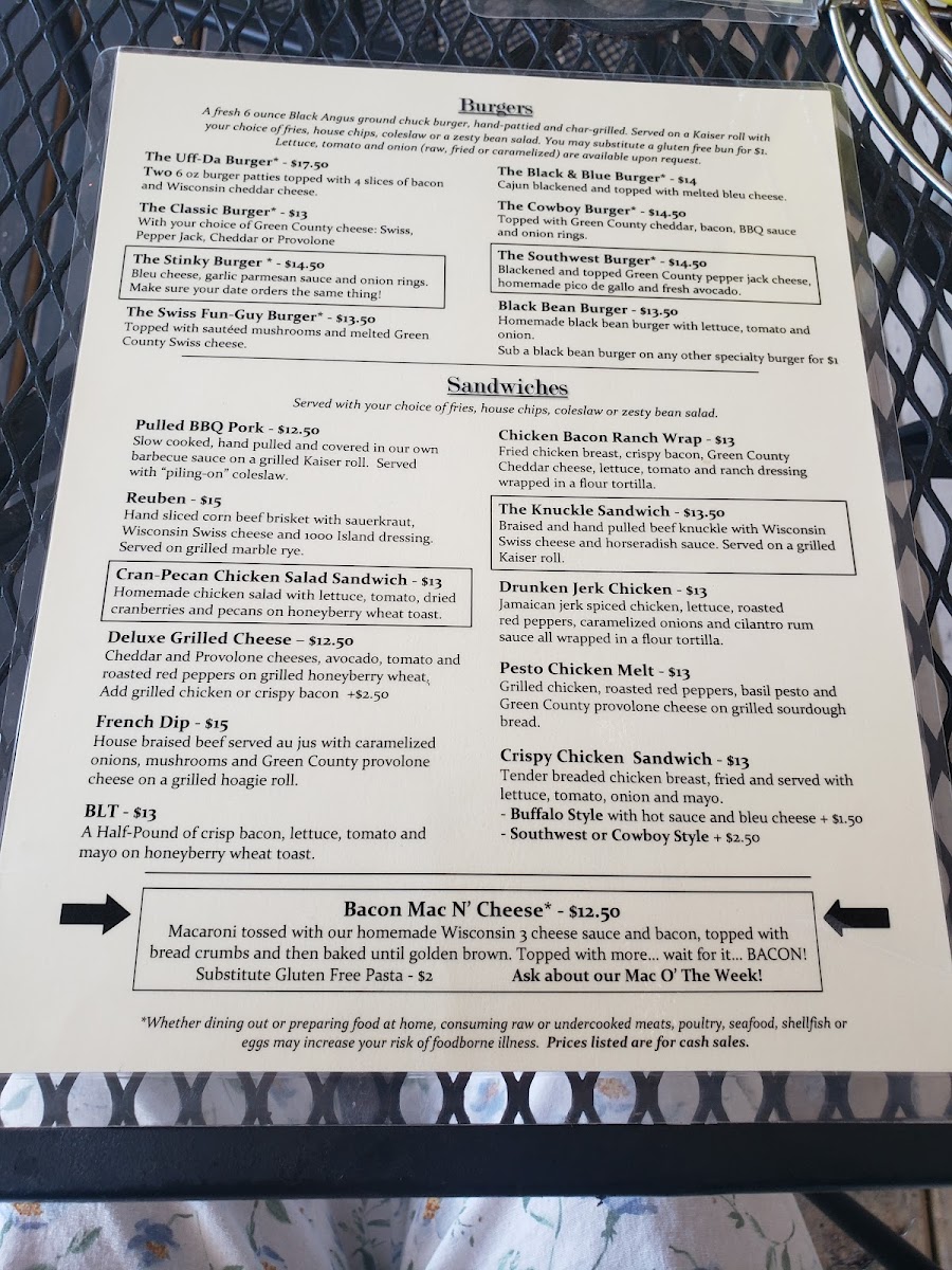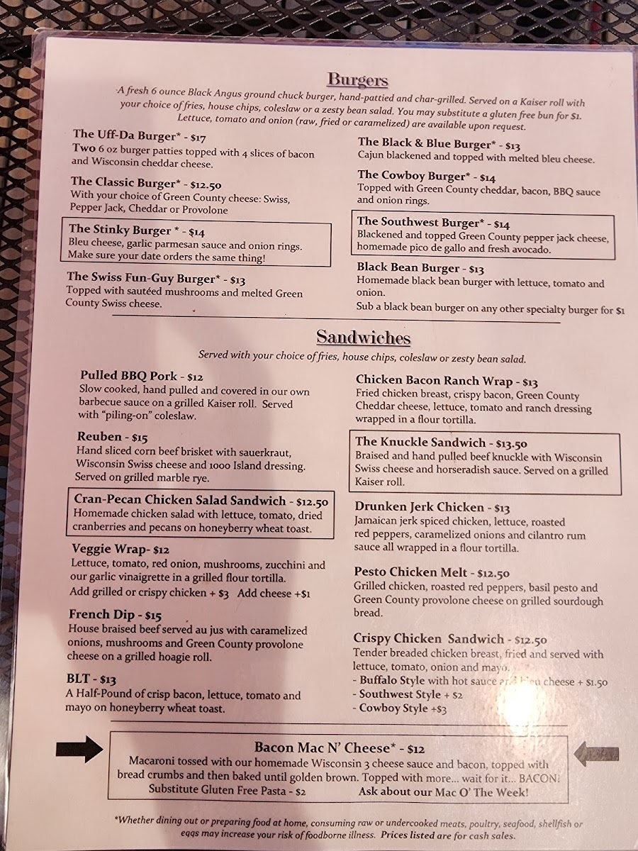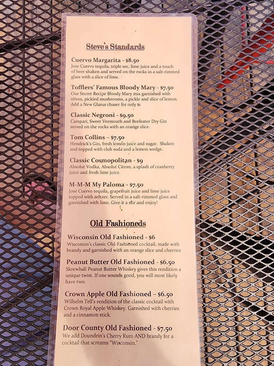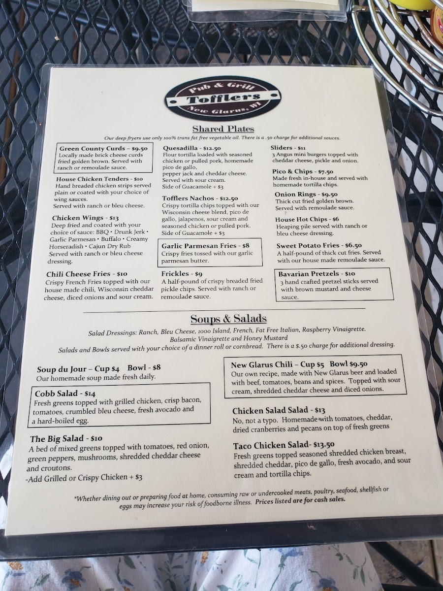 Welcome to Tofflers Pub & Grill, a hidden gem nestled in the heart of New Glarus, WI. With its inviting atmosphere, this pub is perfect for both casual meals and special gatherings. The menu offers an enticing array of options, including hearty soups like the New Glarus Chili and fresh salads such as the Cobb and Balsamic Beef Salad. For those with a sweet tooth, the dessert selection features favorites like New York Cheesecake and a delightful Giant Cookie Sundae.